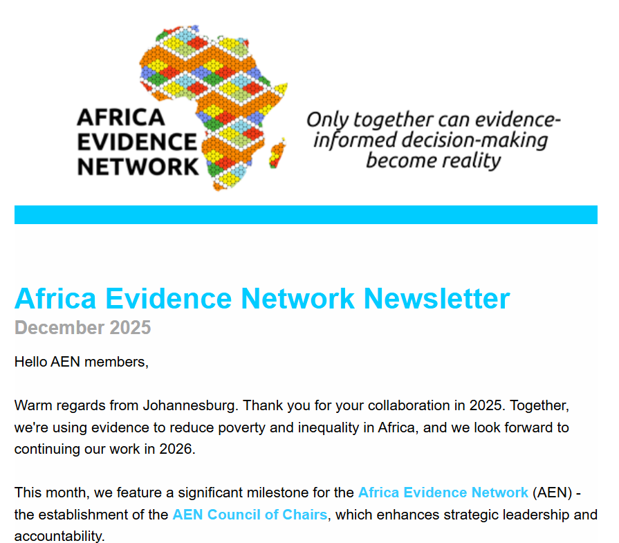 We're excited to share our last #AENnewsletter for the year: https://africaevidencenetwork.org/africa-evidence-network-newsletter-december-2025/2025/12/12/.