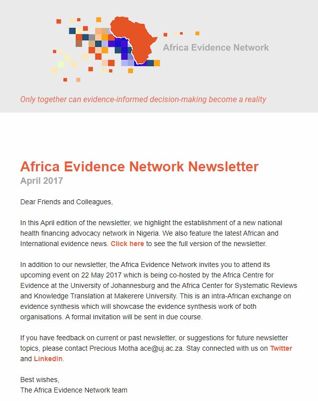 In addition to our newsletter, the Africa Evidence Network invites you to attend its upcoming event on 22 May 2017 which is being co-hosted by the Africa Centre for Evidence at the University of Johannesburg and the Africa Center for Systematic Reviews and Knowledge Translation at Makerere University. This is an intra-African exchange on evidence synthesis which will showcase the evidence synthesis work of both organisations. A formal invitation will be sent in due course.
