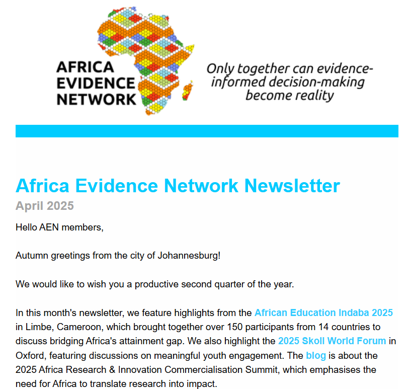 We welcome and encourage your contributions to the AEN newsletter and blog! To share your work or interesting stories from your country or organisation on either of these platforms, send an email to info@africaevidencenetwork.org.