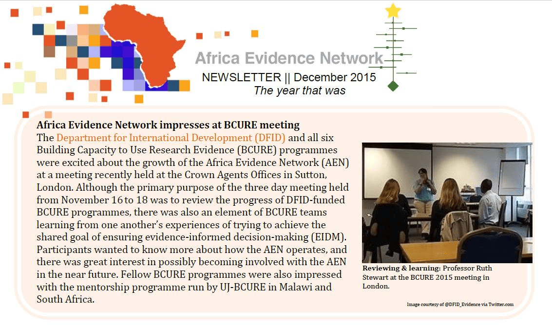 This is the Africa Evidence Network’s newsletter for December 2015. Share this: Share on X (Opens in new window) X Share on Facebook (Opens in new window) Facebook Like this:Like Loading... Related CharityAuthor posts Related Posts Newsupcoming event 4th March 2026Cochrane Colloquium Krakow 2026by Charity Newsupcoming event 24th February 20269th Uganda Evaluation Weekby Charity Newsupcoming event 20th February 202610th SAMEA Biennial Conferenceby Charity Successes, challenges and opportunities for evidence informed policy-making in Zimbabwe Theories of Change and Logic Models: the often-ignored tools for better evaluation