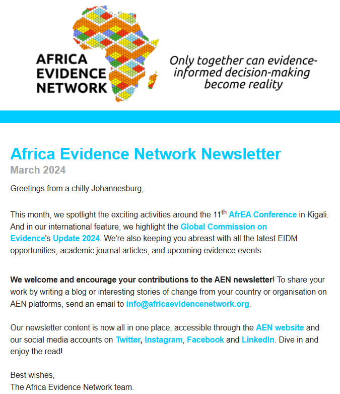 We welcome and encourage your contributions to the AEN newsletter! To share your work by writing a blog or interesting stories of change from your country or organisation on AEN platforms, send an email to info@africaevidencenetwork.org.