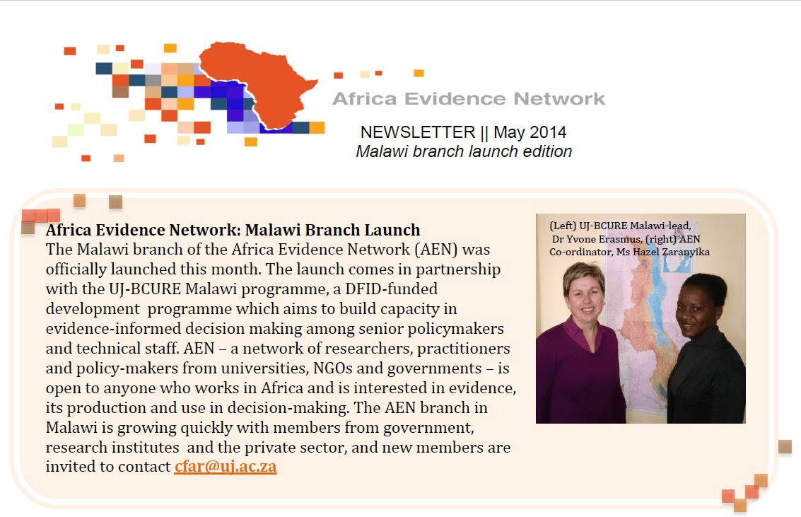 This is the Africa Evidence Network’s newsletter for May 2014. Share this: Click to share on X (Opens in new window) X Click to share on Facebook (Opens in new window) Facebook Like this:Like Loading... Related CharityAuthor posts Related Posts NewsBlog 12th December 2025Five AEN Milestones That Shaped 2025by Charity News 12th December 2025Africa Evidence Network Newsletter December 2025by Charity NewsBlog 12th December 2025Eight Years of Leading the Africa Evidence Network: A Reflection on Community, Courage, and Becomingby Charity Training helps embed EIPM into Ghanaian government practices Africa Evidence Network Newsletter May 2015