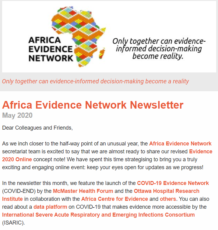 In the newsletter this month, we feature the launch of the COVID-19 Evidence Network (COVID-END) by the McMaster Health Forum and the Ottawa Hospital Research Institute in collaboration with the Africa Centre for Evidence and others. You can also read about a data platform on COVID-19 that makes evidence more accessible by the International Severe Acute Respiratory and Emerging Infections Consortium (ISARIC).