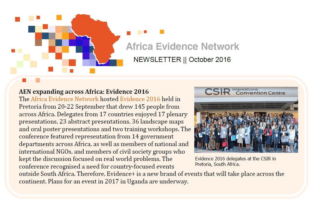 This is the Africa Evidence Network’s newsletter for October 2016. Share this: Share on X (Opens in new window) X Share on Facebook (Opens in new window) Facebook Like this:Like Loading... Related CharityAuthor posts Related Posts Newsupcoming event 4th March 2026Cochrane Colloquium Krakow 2026by Charity Newsupcoming event 24th February 20269th Uganda Evaluation Weekby Charity Newsupcoming event 20th February 202610th SAMEA Biennial Conferenceby Charity Day 3: Networking and relationships the tool of choice? #evidence2016 Evidence 2016: What an exciting and productive conference