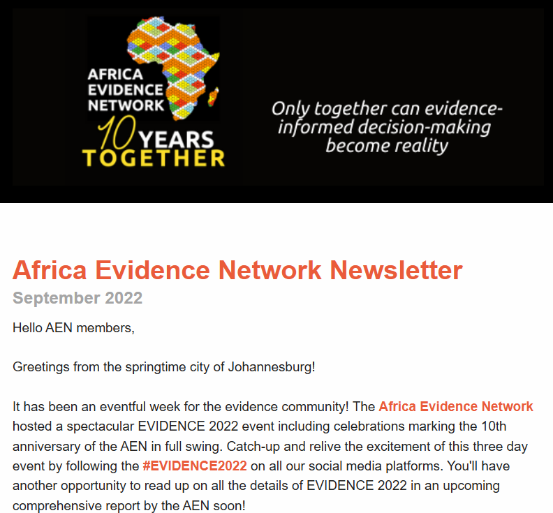 It’s been an eventful week for the evidence community with the Africa Evidence Network’s EVIDENCE 2022 event! In this month’s edition of the AEN newsletter, you can catch-up and relive the excitement of the three day event and you’ll have another opportunity to read up on all the details of EVIDENCE 2022 in an upcoming comprehensive report by the AEN soon! Do not miss the latest EIDM opportunities, academic journal articles, and events in the September edition of the AEN newsletter.