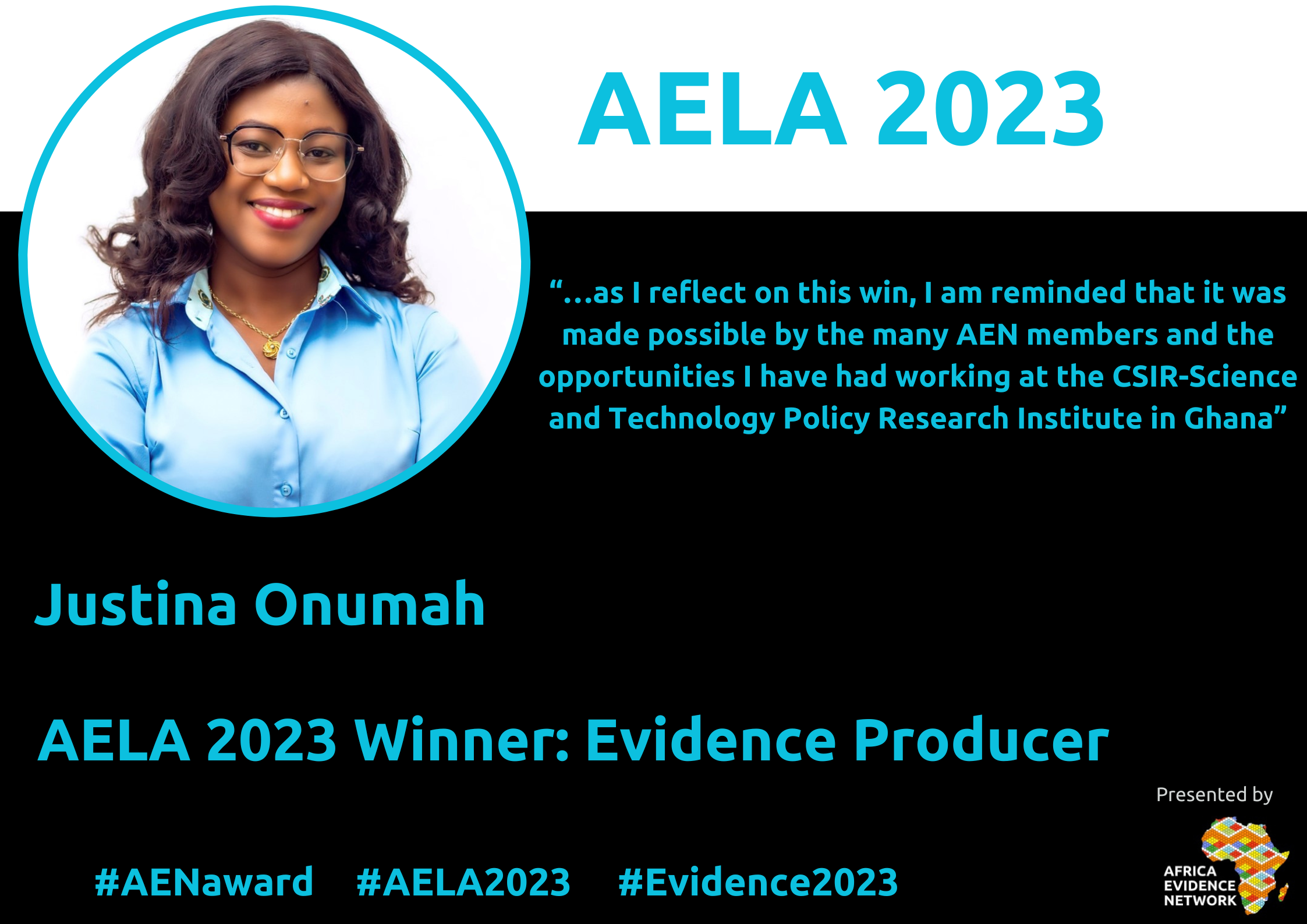 JO: The email notification sound on my phone beeped and I casually checked with no expectations in mind. It was an email communication from the Africa Evidence Network which I initially did not think much of it as correspondence on the voting outcome. Lo and behold, that was it; an email congratulating me for winning the Evidence Producer Category! I quickly jumped on my feet repeatedly saying, “wow Justina, it happened”! To be honest, though no one goes into a competition to lose, I also did not know how I was going to win because all the nominees had solid profiles making the context highly competitive! A part of me was deeply humbled by the confidence of voters in my research works as profiled and a part of me felt a huge responsibility- a responsibility to contribute more in the evidence-policy space in Ghana and Africa as a whole. However, as I reflect on this win, I am reminded that it is was made possible by the many AEN members and the opportunities I have had working at the CSIR-Science and Technology Policy Research Institute in Ghana. These opportunities allowed me to contribute to the core mandate of the Institute, which is to popularize Science, Technology and Innovation (STI) through evidence generation and engagements. One of the very first projects I worked on at the Institute was the Development Research Uptake in Sub-Saharan Africa funded by the UK Department for International Development, through the Association of Commonwealth Universities. The aim of this project was to promote evidence use in policy making through the generation of evidence on key national issues and building capacity of policy makers in using evidence. The experiences under this project spurred my interest in EIDM and the evidence of it is the award we are witnessing at the moment.