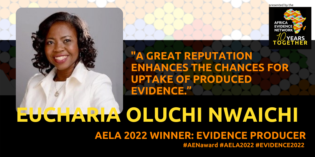Eucharia Oluchi Nwaichi, is the recipient of the Africa Evidence Leadership Award 2022 in the Evidence Producer category offered by the Africa Evidence Network. We caught up with Eucharia about receiving the award and asked her some questions about what the Africa Evidence Leadership Award means for her work.