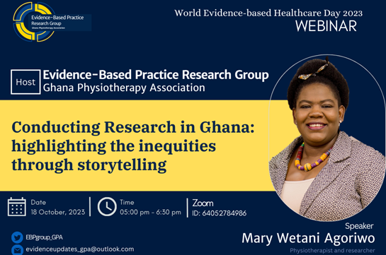 Research informs EBP and in the conduct of research, researchers face several challenges globally but even more in lower-middle-income countries (LMICs) such as Ghana with limited resources and other competing factors. The World Evidence-based Healthcare Day 2023 campaign was focused on “Evidence and Global Health Equity” and aimed to examine how the global evidence community can foster and embed equity within and across evidence ecosystems to advance global health equity. As part of our advocacy arm, the EBP Research Group of the Ghana Physiotherapy Association joined other stakeholders in the 2023 campaign by hosting a webinar themed; “Conducting Research in Ghana: highlighting the iniquities through Storytelling”. This webinar discussed the challenges facing Ghanaian researchers and clinicians in conducting and publishing research, as well as recommendations to address these challenges through storytelling.