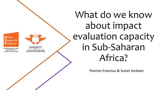 The speakers were Dr. Yvonne Erasmus and Ms. Sunet Jordaan, who shared findings of their scoping study of impact evaluation capacity in Sub-Saharan Africa. The study highlights that there is lots of capacity in Africa to do monitoring and evaluation, and supports the case for sharing this capacity widely.