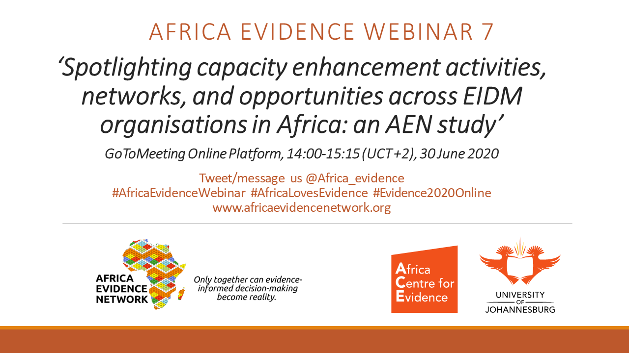 The Africa Evidence Network (AEN) hosted its 7th #AfricaEvidence webinar on 30 June 2020, entitled: “Spotlighting capacity enhancement activities, networks, and opportunities across EIDM organisations in Africa: an AEN study.” Drs Linda Etale and Nasreen Jessani from the AEN secretariat shared the results of a study conducted by the AEN secretariat that explored the capacity development activities of EIDM organisations in Africa. The study also investigated the potential for collaboration across institutions working in a similar space in Africa. They also shared the ongoing and planned activities in response to the recommendations.