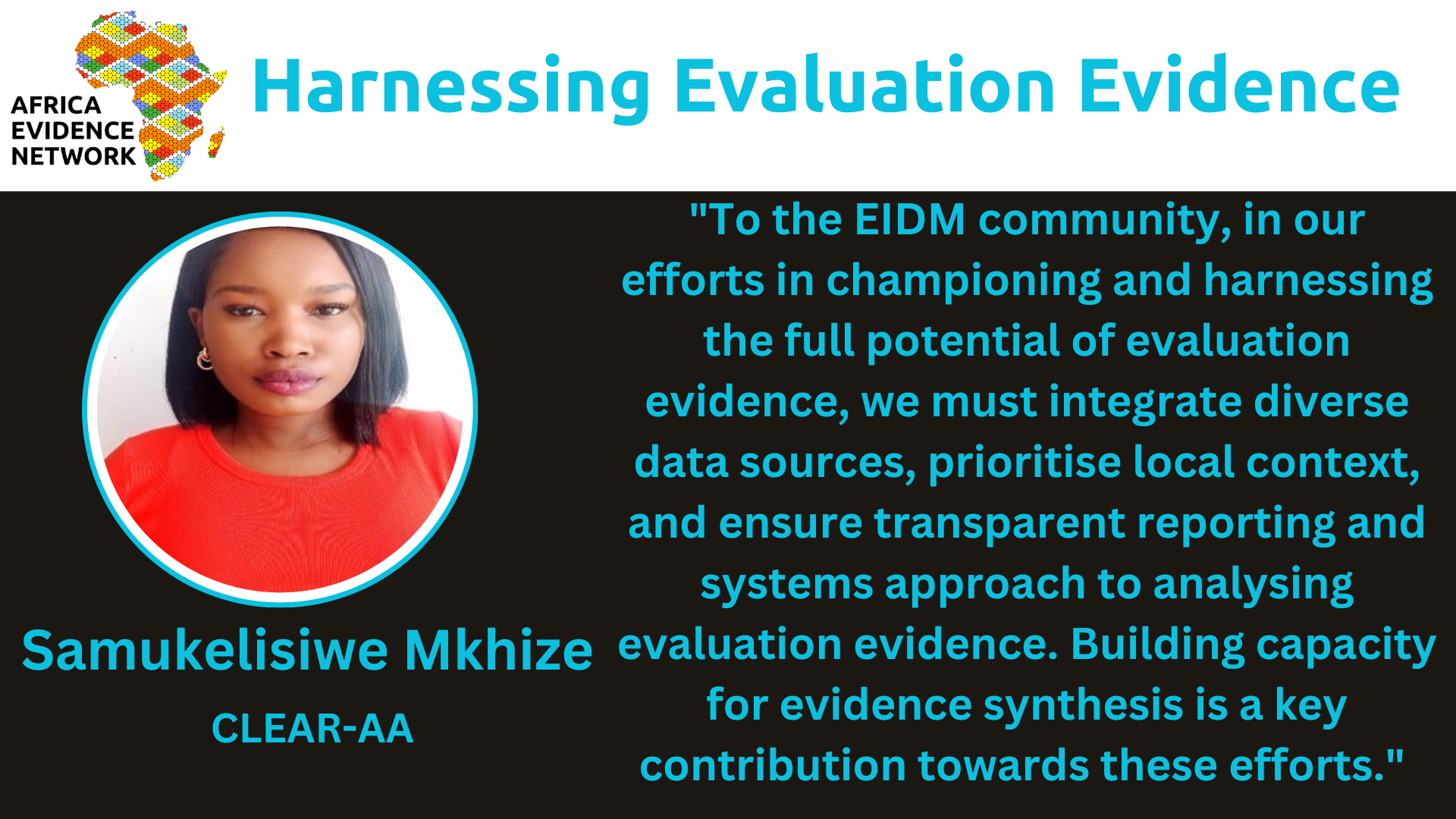 To the EIDM community, in our efforts in championing and harnessing the full potential of evaluation evidence, we must integrate diverse data sources, prioritise local context, and ensure transparent reporting and systems approach to analysing evaluation evidence. Building capacity for evidence synthesis is a key contribution towards these efforts.