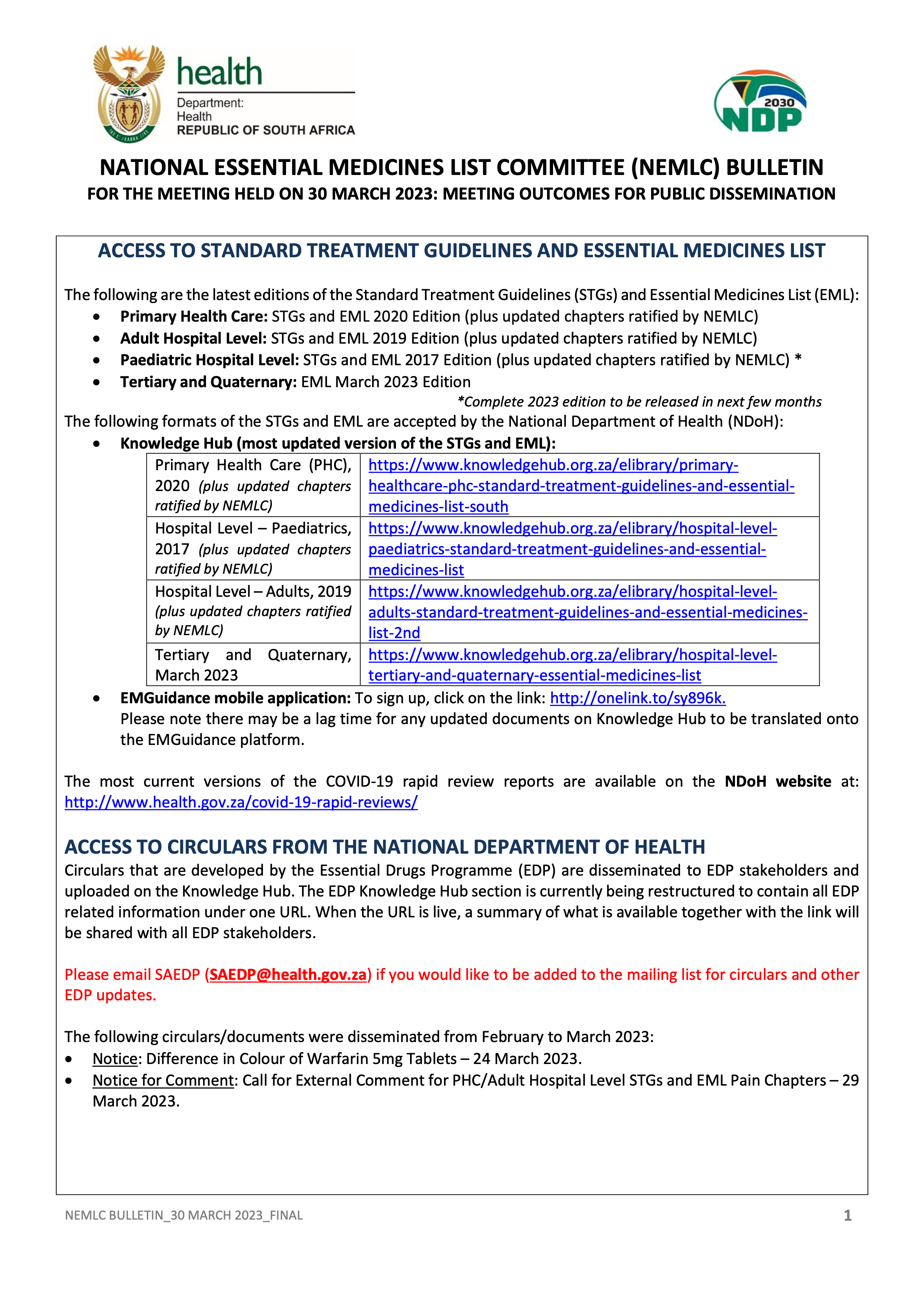 • Adult Hospital Level: STGs and EML 2019 Edition (plus updated chapters ratified by NEMLC)