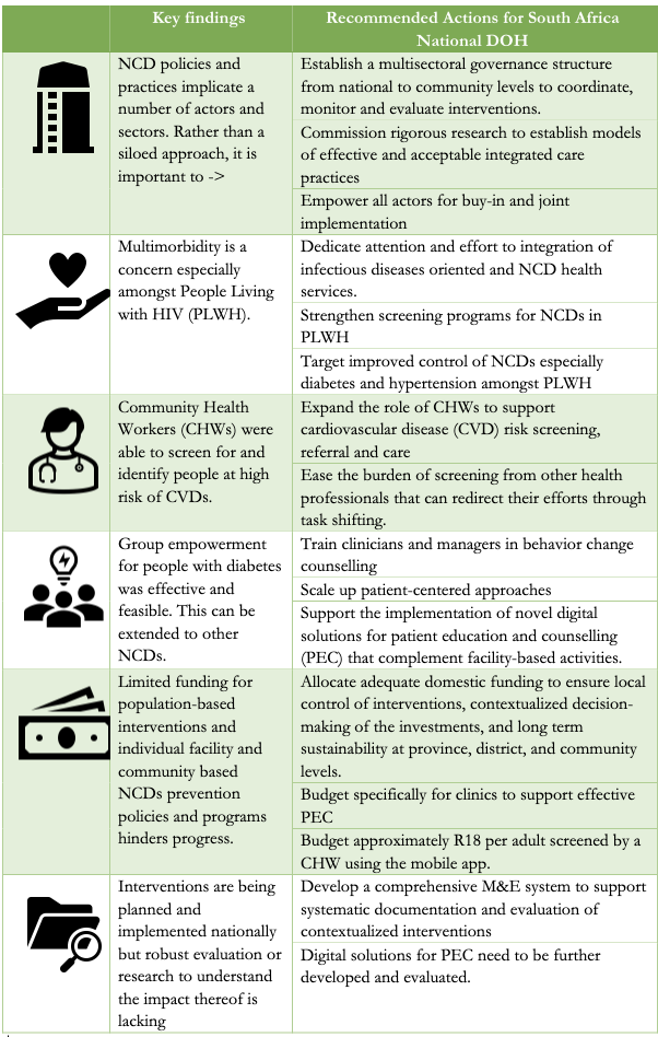 The social, health and economic burden of non-communicable diseases (NCDs) to the South African economy and social fabric has not gone unnoticed. South Africa has frequently updated its strategies to combat NCDs in order to slow and even reverse the impact of NCDs on its GDP over time. In this blog we outline more recent NCD action in South Africa, research to support the action, and recommendations that consider where implementation is challenged and concerted efforts are needed to advance a multi-level, multisectoral, and multi-actor integrated approach.