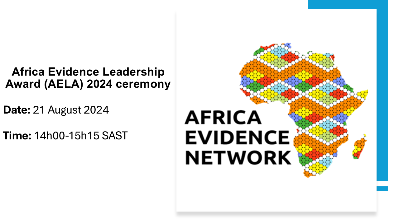 The Africa Evidence Network hosted its 6th Africa Evidence Leadership (AELA) award ceremony online during Africa Evidence Week on 21 August 2024 from 14:00 to 15:15 hours (SAST). This webinar was an opportunity for the AELA winners and runners-up to celebrate their remarkable achievements.