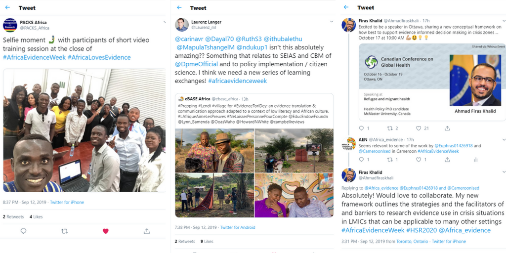Africa Evidence Week is exceeding all of our expectations, and this is because of the incredible participation by organisations from across Africa and the globe celebrating Africa’s EIDM. On day 4, the @Africa_evidence account had 17500 impressions, 156 retweets, 202 likes, and 57 clicks per link. Some of the highlights from this busy day on Twitter include: